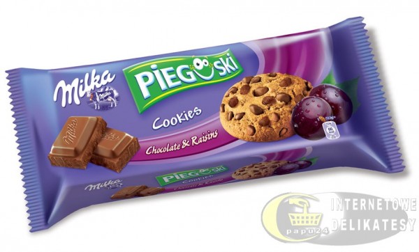 Milka Pieguski Cookies Chocolate & Raisins 135g - wyśmienite ciasteczka firmy Milka. W Pieguskach Ciasteczkach znajdują się kawałki najdelikatniejszej mlecznej czekolady Milka, a także dodatki takie jak: kruche orzechy laskowe, słodkie rodzynki, delikatny kokos i smaczne migdały.