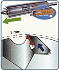 ukośnie ryflowana metalowa rolka wciągająca, zapewniająca stałe i równe wciąganie materiału