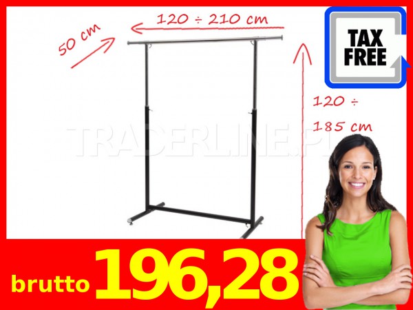 Wymiary: szerokość regulowana od 120 do 210 cm, głębokość 50 cm, wysokość regulowana od 120 do 185 cm.