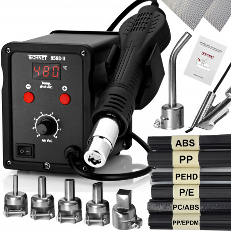 Spawarka Technet 858D-II to zaawansowane narzędzie do naprawy elementów z tworzyw sztucznych, łączące wysoką wydajność z prostą obsługą. Urządzenie wyposażone jest w ceramiczny element grzejny oraz system płynnej regulacji temperatury i nadmuchu powietrza — od ok. 100°C do 480°C, co pozwala dostosować parametry do różnych rodzajów plastiku. W zestawie znajduje się kilka wymiennych dysz (m.in. długa, krótka, dysza typu „BUT”), które umożliwiają pracę w trudno dostępnych miejscach oraz wykonywanie precyzyjnych spoin. Dzięki wyświetlaczowi LED użytkownik ma stałą kontrolę nad temperaturą, a ergonomiczna kolba zapewnia komfort pracy nawet przy dłuższych zadaniach. Zestaw często obejmuje również siatki wzmacniające spoinę oraz materiały spawalnicze, co zwiększa zakres zastosowań i gotowość do pracy od razu po rozpakowaniu. Spawarka świetnie sprawdza się przy naprawach zderzaków, uchwytów lamp, zbiorników i innych części z tworzyw termoplastycznych oraz może służyć również do lutowania elementów elektronicznych.