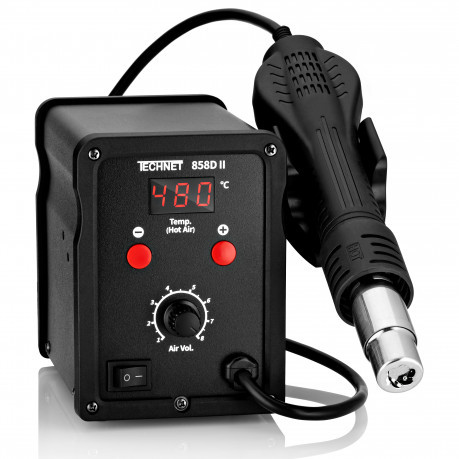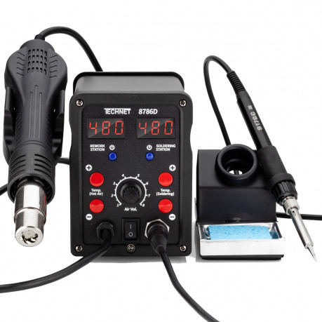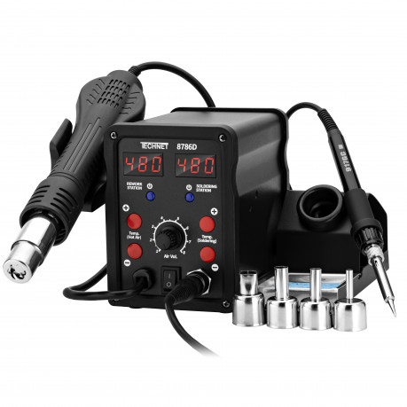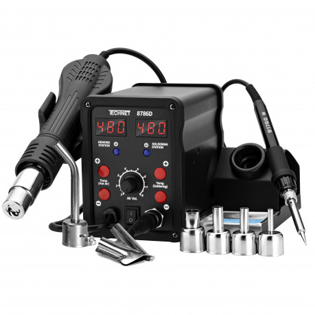 Model Technet 8786D to wydajna i wszechstronna spawarka do plastiku z dodatkowymi funkcjami 2-w-1. Urządzenie łączy kolbę gorącego powietrza (Hot-Air) z lutownicą grotową, co daje większą elastyczność pracy: gorące powietrze wykorzystasz do tradycyjnego spawania i formowania plastików, a grot do precyzyjnego łączenia pęknięć lub drobnych napraw. Spawarka ma płynną, elektroniczną regulację temperatury i nadmuchu powietrza w zakresie ok. 100–480 °C oraz ceramiczny element grzejny, co zapewnia równomierne nagrzewanie i stabilną pracę. Urządzenie posiada również wyświetlacz LED pokazujący temperaturę zadaną i rzeczywistą, co ułatwia kontrolę procesu. W zestawie zwykle znajdują się dysze do różnych zastosowań, dysza typu „BUT” do szybkiego spawania, siatki wzmacniające spoiny oraz dodatkowe akcesoria takie jak grot T-K do wstępnej fuzji pęknięć. Dzięki temu model 8786D sprawdza się zarówno przy naprawach większych elementów z plastiku, jak i delikatniejszych detali, a także przy lutowaniu drobnych elementów elektronicznych czy obkurczaniu przewodów.