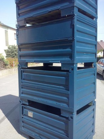 Pojemnik magazynowo - transportowy (skrzyniopaleta sztaplowana). Wymiar pojemnika top 1240 x 835 x 770 mm. Pojemnik posiada uchwyty na zawiesia i jego bok jest otwierany do połowy.