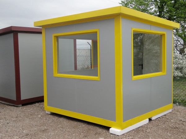 Pawilon wartowniczy o wymiarach zewnętrznych 2,6m x 2,4m wykonany z płyt warstwowych z rdzeniem styropianowym o grubości 100mm sklasyfikowanych jako wyrób nie rozprzestrzeniający ognia w klasie odporności ogniowej E-60 (ściany,podłoga,dach). Wyposażony jest w dwie witryny 1500mm x 1000mm i drzwi pełne stalowe 800mm x 2050mm. Cena netto.
