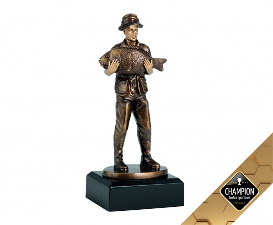 Wędkarz trzymający dużą rybę - figurka odlewana, znakomita nagroda dla zwycięzcy zawodów wędkarskich. Na czarnej drewnianej podstawie przyczepimy aluminiową tabliczkę z dedykacją, którą wykonamy GRATIS!
