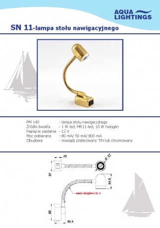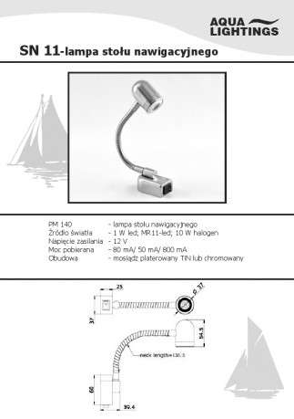 Lampa stołu nawigacyjnego, led 1 W,MR 11,odporna na korozję, montaż powierzchniowy, mosiądz chromowany lub platerowany TiN