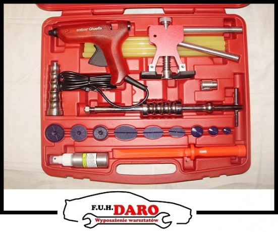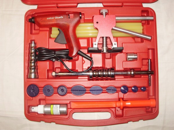 w zestawie: młotek, podnośnik, adapter (9 szt.), pistolet do kleju (STEINEL 175W), pałeczki klejowe (8 szt.), plastikowa szpatułka, narzędzie do usuwania kleju, walizka