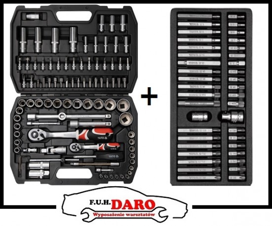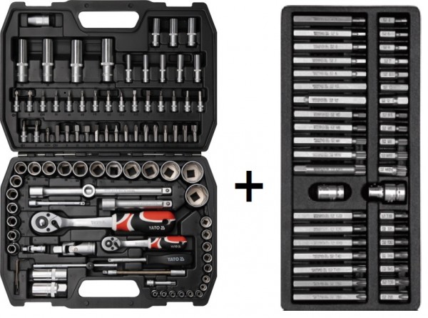 Nasz zestaw składa się z 94 elementów, nasadki wykonane są z wytrzymałej stali narzędziowej, chromowo wanadowej CrV 50BV30. Grzechotki występujące w zestawie wykonane są ze stali CrV 6140 wg najwyższych standardów technologicznych YATO i posiadają 72 zęby. Bity wykonane są z wytrzymałej stali S2. Nasz zestaw idealnie nadaje się do potrzeb profesjonalnych serwisów mechanicznych i samochodowych. Dodatkowo w skład zestawu wchodzą także grzechotki, pokrętło fajkowe i nasadki do świec. Zestaw bardzo wytrzymały przystosowany do odkręcania i przykręcania różnorakich śrub i połączeń.