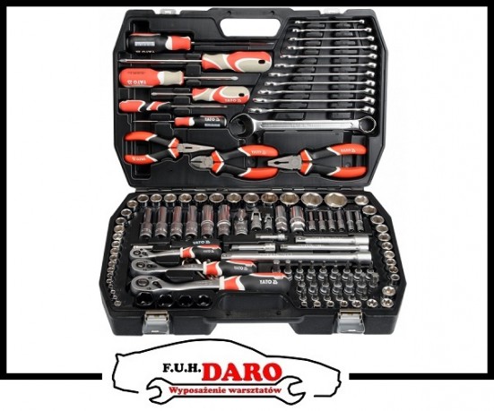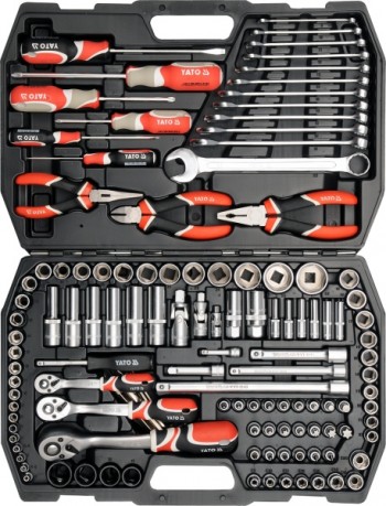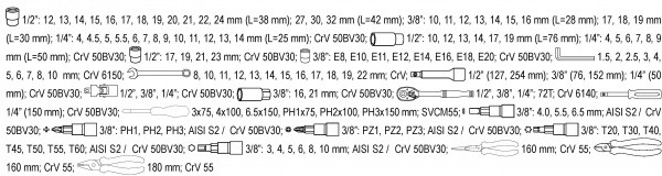 Zestaw zawiera 129 części. Nasadki i napęd nasadek w rozmiarze 1/2" 1/4" 3/8" wykonane są z wytrzymałej stali narzędziowej, chromowo wanadowej CrV 50BV30. Grzechotka ze stali CrV 6140 oraz S2 posiada 72 zęby i wykonana jest wg najwyższych standardów technologicznych YATO. Umożliwia pracę wymagającą bardzo dużych obciążeń i precyzji, pozwala wykonywać wiele czynności serwisowych związanych z odkręcaniem i przykręcaniem połączeń gwintowych o różnych rozmiarach nominalnych.