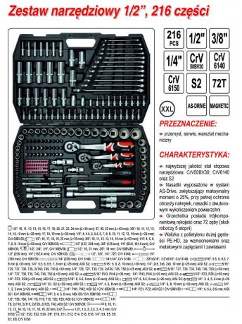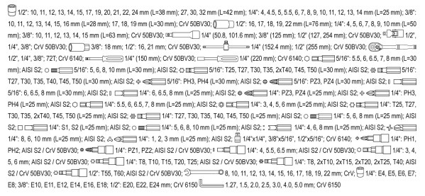 Nasadki i napęd nasadek w rozmiarze 1/2" 1/4" 3/8" wykonane są z wytrzymałej stali narzędziowej, chromowo wanadowej CrV 50BV30. Grzechotka ze stali CrV 6140 oraz S2 posiada 72 zęby i wykonana jest wg najwyższych standardów technologicznych YATO. Umożliwia pracę wymagającą bardzo dużych obciążeń i precyzji, pozwala wykonywać wiele czynności serwisowych związanych z odkręcaniem i przykręcaniem połączeń gwintowych o różnych rozmiarach nominalnych.