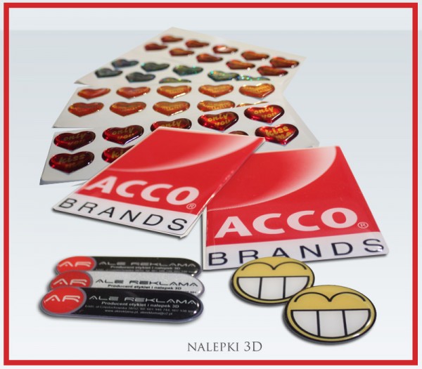 Naklejki drukowane na wysokiej jakości folii samoprzylepnej i pokrywane polimerem dającym efekt trójwymiarowości / głębi.
