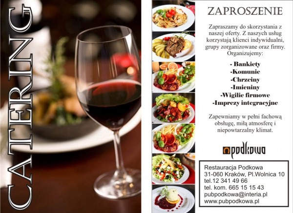 Restauracja&Pub Podkowa organizuje różnego rodzaju imprezy. Chcesz zorganizować imprezę firmową, integracyjną, bankiet, imprezę okolicznościową, osiemnastkę, wieczór panieński/kawalerski? Zapraszamy do kontaktu! Posiadamy 200 miejsc w lokalu oraz 120 w letnim ogródku. Zapewniamy menu dostosowane do preferencji kulinarnych. Na każdej imprezie po uzgodnieniu warunków, w cenie zapewniamy: dekoracje, DJ, ochronę i fotografa! Nasz lokal cieszy się dużą popularnością! Serdecznie zapraszamy do zapoznania się z naszą przykładową ofertą.