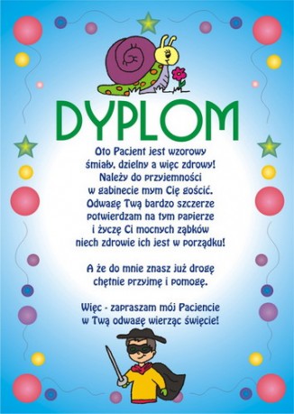 Dyplom Dzielnego Pacjenta w kolorystyce i rodzajach dla dziewczynki i chłopca pozwala nagrodzić wyjątkowo dzielnych Pacjentów. Dla tych z Państwa, którzy nie mają czasu wersja bez wypisywania nazwiska i imienia, dla chcących podkreślić imiennie odważnego Pacjenta - wersja z możliwością zapisania imienia i nazwiska Pacjenta.