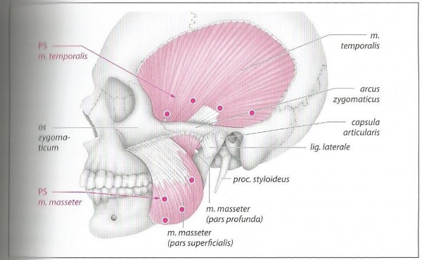 -ból w okolicy stawu skroniowo-żuchwowego, czasem rozlewający się do miejsc promieniowania punktów spustowych lub ból przeniesiony do głowy