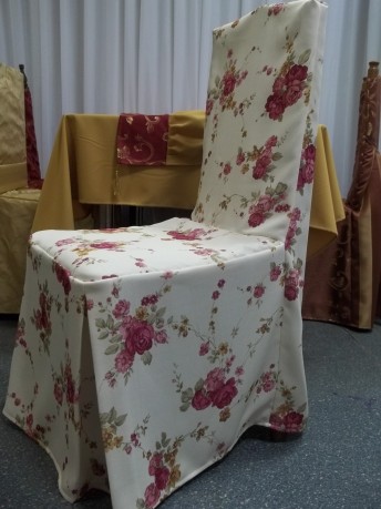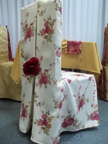 Ozdobny tył pokrowca posiada kontrafałdę na całej wysokości zapinaną kwiatem róży na agrafce/szamerunkiem. Dwie kontrafałdy na przedniej falbanie przy narożnikach siedziska.We wnętrze pokrowca wszyta guma utrzymująca pokrowiec stabilnie na krześle.