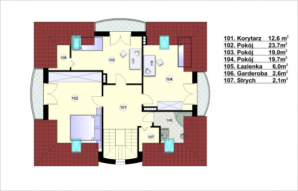 Na poddaszu rozmieszczono trzy sypialnie. Jedna z sypialni posiada garderobę. Jest tu również obszerna łazienka oraz niewielki strych.