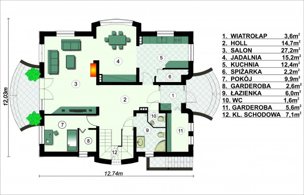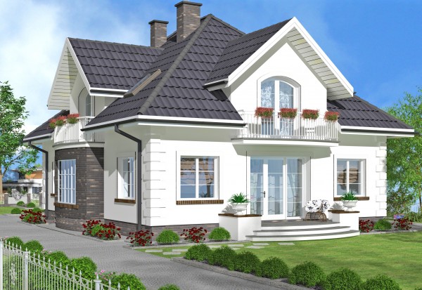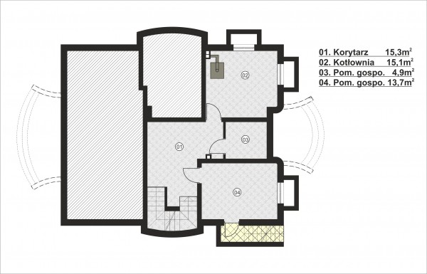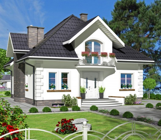 Efektowny i wygodny dom jednorodzinny przeznaczony dla 4 – 5 osobowej rodziny, z piwnicą i poddaszem użytkowym. W części dziennej zaprojektowano duży salon z wyjściem na taras i kominkiem, jadalnię z efektownym wykuszem i kuchnie z wygodną spiżarnią. Wiatrołap zaopatrzony jest w garderobę. Pod schodami usytuowano jakże przydatny schowek. Łazienkę podzielono na : WC dla gości oraz łazienkę z natryskiem i WC dla domowników. Na parterze znajduje się również dodatkowy pokój z garderobą dla gości.