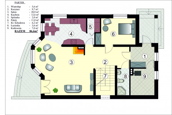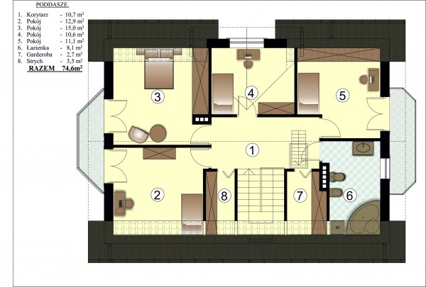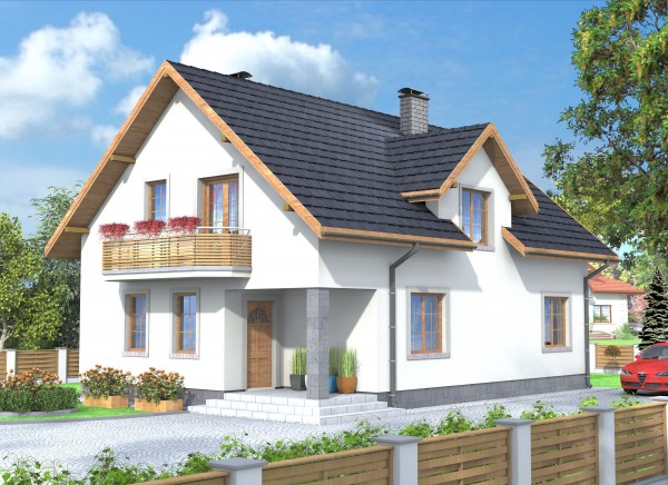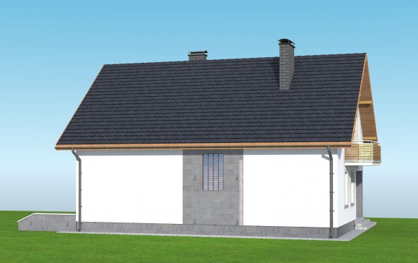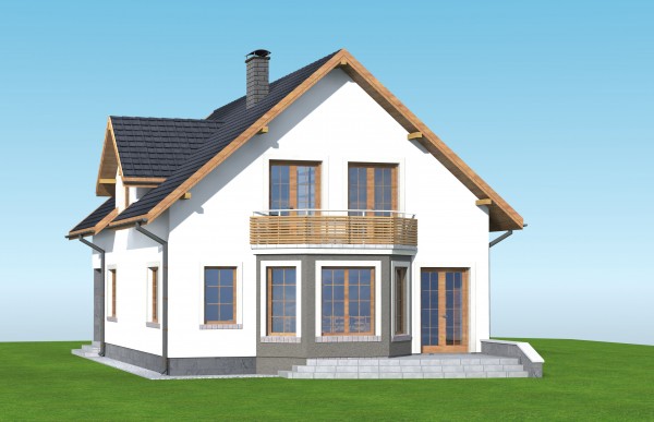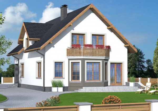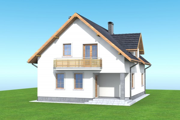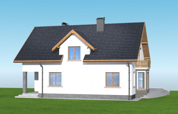 Dom o zgrabnie zaprojektowanej sylwetce dla 4 - 6 osobowej rodziny. Do domu prowadzą zadaszone drzwi wejściowe, którymi wchodzimy do wiatrołapu, a następnie do domu. W wiatrołapie znajdują się również drzwi do kotłowni. Z wiatrołapu idąc dalej korytarzem w głąb domu mijamy po prawej stronie pokój gościnny, który może służyć również jako gabinet. Po lewej stronie znajduje się nieduża łazienka a za nią zaprojektowano schody, które prowadzą na poddasze. W głębi domu usytuowany jest obszerny salon z kominkiem i wyjściem na taras. Salon harmonijnie połączony jest z kuchnią, która zaopatrzona jest w spiżarkę. Na poddaszu znajduą się cztery sypialnie, w tym trzy posiadają wyjścia na balkon. Łazienka zaprojektowana na piętrze jest dwa razy większa niż na parterze. Tutaj znajduje się również garderoba i niewielki strych.