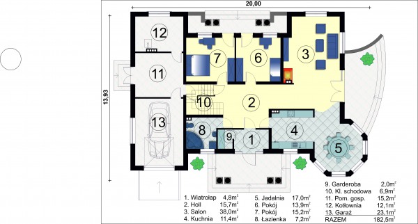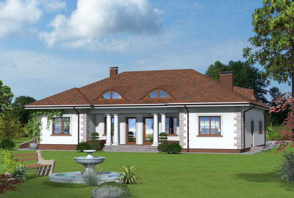 Parterowy dom o eleganckiej bryle zaprojektowany na wzór dworku. Uroku dodaje mu wieżyczka na bazie ośmiokąta oraz lukarny w kształcie tzw. "bawolego oka". Dom przeznaczony jest dla 3 - 4 osobowej rodziny. Część dzienną, przeznaczoną do wypoczynku, stanowi obszerny salon z wyjściem na taras. Obok salonu znajduje się kuchnia wraz z jadalnią. Część nocna to 2 sypialnie. Posiadają one wyjście na drugi taras, który prowadzi na tył budynku. Obok łazienki, pod schodami, które prowadzą na strych, znajduje się przejście do pomieszczenia gospodarczego, a dalej do kotłowni i jednostanowiskowego garażu.