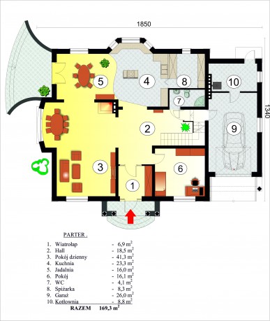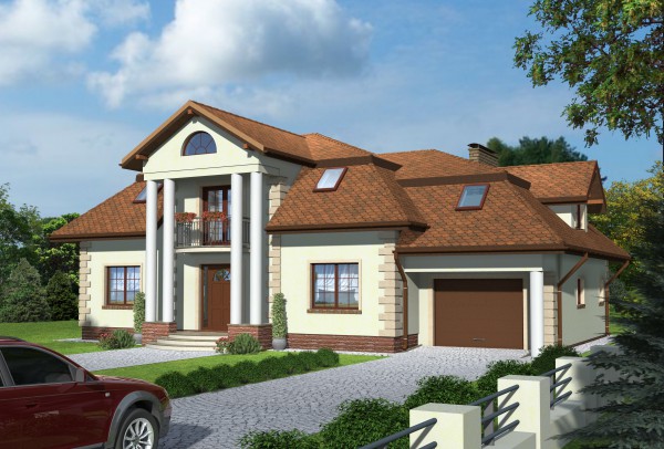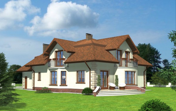Wygodny i przestronny dom o ciekawie zaprojektowanej kubaturze. Projekt tego domu to idealna propoaycja dla 4 - 5 osobowej rodziny. Jest to dom z poddaszem użytkowym. Na parterze znajduje się dobrze doświetlony pokój dzienny, który jest otwarty na jadalnie, kuchnie oraz holl. W jadalni znajduje się wyjście na obszerny taras. Kuchnia zaopatrzona jest w spiżarkę. Na parterze znajduje się również dodatkowy pokój, który może służyć jako gabinet lub pokój dla gości. Pod schodami obok drzwi do łazienki znajduje się wejście do jednostanowiskowego garażu i dalej do kotłowni.
