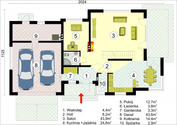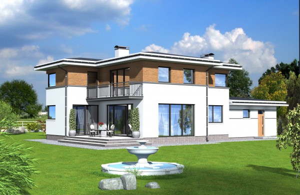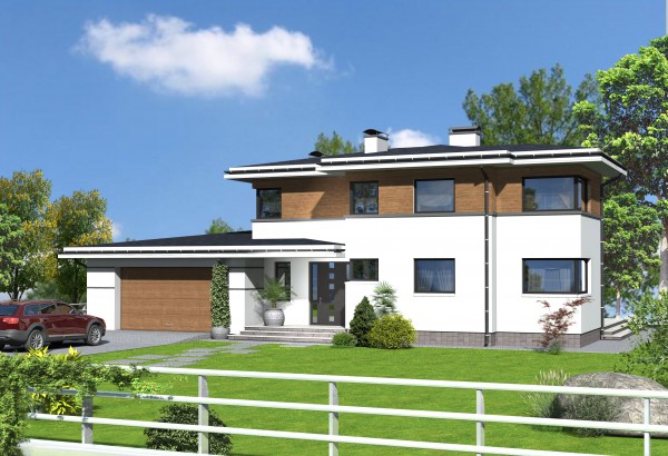 Dom o nowoczesnej bryle, zgrabnej sylwetce, wygodny i funkcjonalny. Przeznaczony jest dla 4 - 5 osobowej rodziny. Na parterze budynku zaprojektowano obszerny salon z wyjściem na taras. W salonie zaaranżowano schody, które prowadzą na piętro. Kuchnia wraz z jadalnią otwarta jest na salon oraz niewielki holl. Przy kuchni znajduje się jakże potrzebna spiżarka. Na parterze znajduje się dodatkowy pokój, który może służyć jako gabinet lub pokój dla gości. Obok pokoju zaprojektowano łazienkę. Poprzez wiatrołap możemy przejść do dwustanowiskowego garażu a za nim dalej do kotłowni.