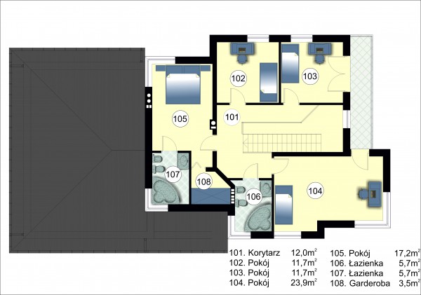 Na piętrze znajdują się cztery sypialnie, przy czym jedna z sypialni posiada prywatną łazienkę i garderobę. Dla pozostałych sypialni zaprojektowano łazienkę z wejściem z korytarza.