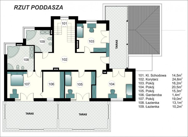 Na piętrze znajdują się cztery sypialnie, przy czym jedna z sypialni posiada prywatną łazienkę i garderobę. Dla pozostałych sypialni zaprojektowano łazienkę z wejściem z korytarza.