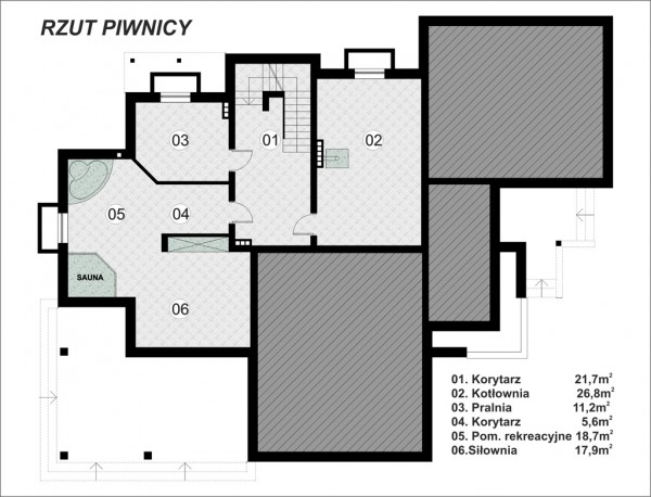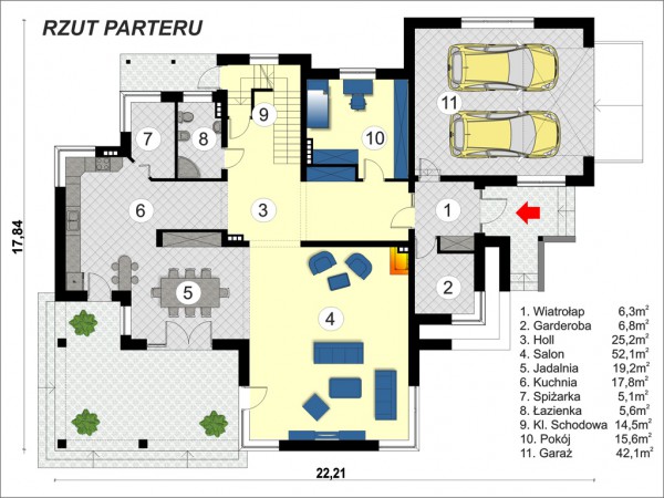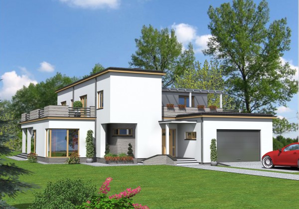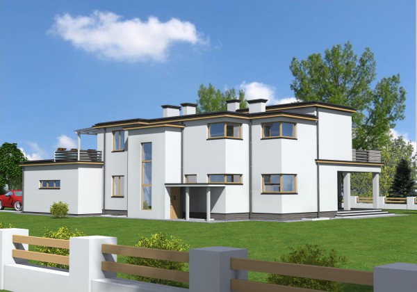 Dom o nowoczesnej bryle, zgrabnej sylwetce, wygodny i funkcjonalny. Przeznaczony jest dla 4 - 5 osobowej rodziny. Na parterze budynku zaprojektowano obszerny salon z wyjściem na taras. W salonie zaaranżowano schody, które prowadzą na piętro. Kuchnia wraz z jadalnią otwarta jest na salon oraz niewielki holl. Przy kuchni znajduje się jakże potrzebna spiżarka. Na parterze znajduje się dodatkowy pokój, który może służyć jako gabinet lub pokój dla gości. Obok pokoju zaprojektowano łazienkę. Poprzez wiatrołap możemy przejść do dwustanowiskowego garażu a za nim dalej do kotłowni.