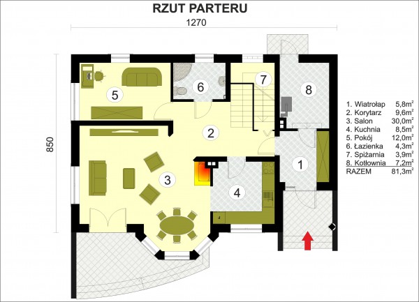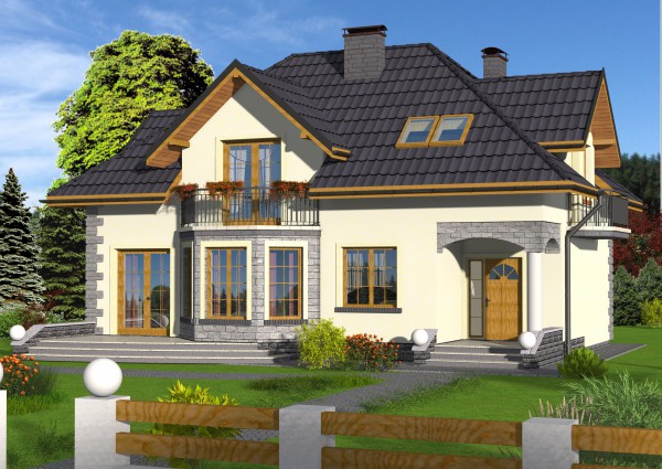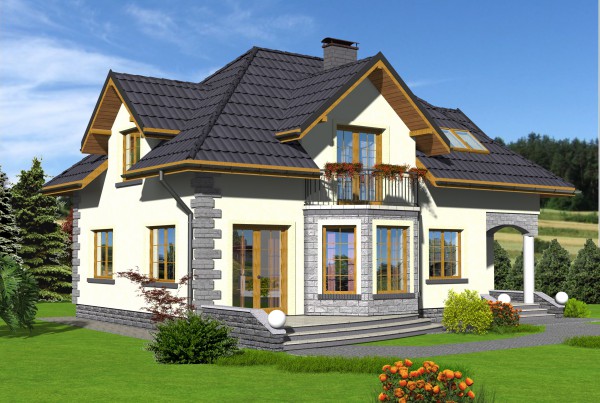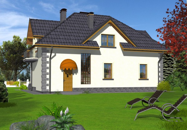 Efektowny dom jednorodzinny przeznaczony dla 4 - 5 osobowej rodziny. Do domu wchodzimy po niewysokich schodach do wiatrołapu, skąd na wprost znajduje się wejście do kotłowni, zaś po lewej stronie znajduje się wejście do części dziennej domu. Idąc dalej po prawej stronie mijamy schody na poddasze, zaś po lewej wejście do kuchni. Kuchnia jest otwarta na salon i jadalnię. Z salonu możemy wyjść na taras. Na parterze znajduje się dodatkowy pokój, który może służyć jako gabinet. Obok gabinetu znajduje się łazienka.