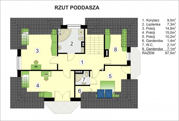 Na poddaszu usytuowano trzy sypialnie, z których jedna posiada prywatną łazienkę i garderobę. Dwie sypialnie posiadają wyjście na balkon. Na poddaszu znajduje się również łazienka i garderoba dla wszystkich.