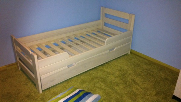Drewniane łóżeczko jesionowe 160 x 70. Na zdjęciu jest pomalowane na kolor biały transparentny, który doskonale uwidacznia fakturę drewna. Możemy pomalować na interesujący Państwa kolor.
