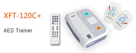 Symulator AED (automatyczny defibrylator zewnętrzny Trener) XFT-120C + jest nowszym modelem symulatora AED XFT120-c. Ten model posiada jeszcze bardziej funkcjonalny pilot zdalnego sterowania oraz fizyczny przełącznik wyboru języka (angielki lub polski). Dioda LED w momencie zalecanego masażu serca miga z częstotliwością 100 razy na minutę co może służyć jako "metronom" prawidłowej częstotliwości uciskania serca (100 /min).