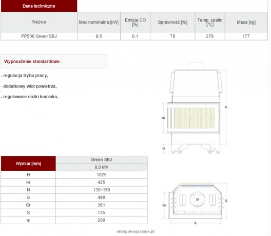 Wkład kominkowy, powietrzny o mocy 7 - 9kW ogrzewa powierzchnię 70-90 m², wykonany jest ze stali Szyba ma kształt płaski, a cały wkład kominkowy utrzymany jest w stylu nowoczesnym. Drzwi otwierają się na prawo. Średnica wylotu spalin to 200mm zaś sam wylot spalin umiejscowiony jest u góry. Wkład kominkowy PP500 GREEN SBJ opalany jest drewnem.