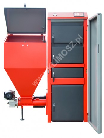 kocioł stalowy dwupaleniskowy z palnikiem rynnowym na węgiel brunatny, miał węglowy, pelety, eko-groszek, dodatkowo w ręcznym palenisku drewno, węgiel