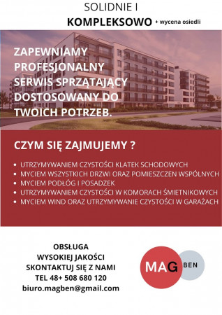 MAGBEN to profesjonalna firma sprzątająca z Warszawy, specjalizująca się w utrzymaniu czystości biur, osiedli oraz placówek handlowych i usługowych. Oferujemy kompleksową obsługę sprzątania, elastyczne harmonogramy, indywidualne wyceny oraz stałą jakość potwierdzoną opiniami klientów. Pracujemy na nowoczesnym sprzęcie i bezpiecznych środkach czystości, gwarantując higieniczne i estetyczne przestrzenie.